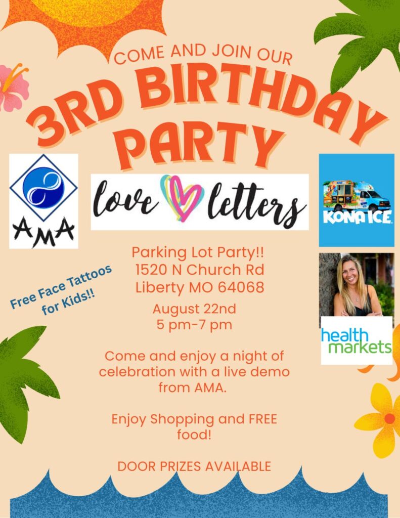 Join AMA in celebrating the 3rd birthday of Advanced Sports and Family Chiropractic and Acupuncture. Enjoy an AMA demo team performance; shop local businesses, including Love Letter and Health Markets; grab a cooling treat from Kona Ice, and a free temporary face tattoo for the kids! FREE food and door prizes! 1520 N Church Rd, … Continued
